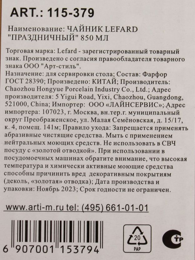 Чайник заварочный фарфор Lefard 0.85 л — идеальный выбор для уютных чаепитий: классический дизайн, прочный фарфор, выгодная цена для подарка или дома.