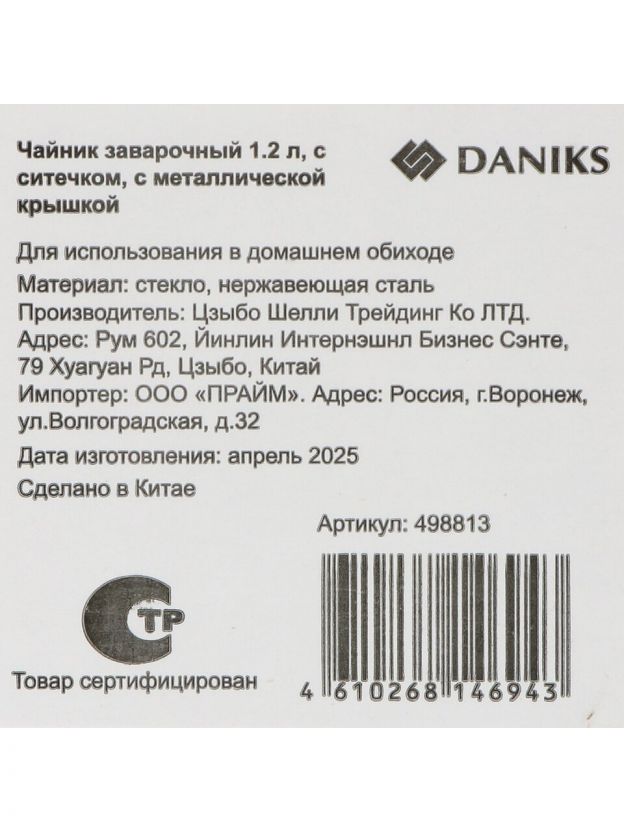 Чайник заварочный стекло, 1.2 л, с ситечком, с металлической крышкой, Daniks, TP1200S