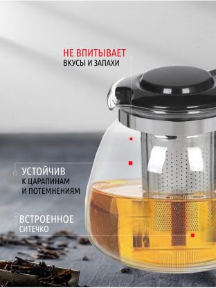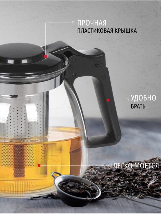 Стильный и эргономичный заварочный чайник. Чай дольше остается горячим, а полезные и ароматические вещества полностью сохраняются в напитке. Простой и удобный чайник поможет Вам приготовить крепкий, ароматный чай. Удобный фильтр не позволит чаинкам или мелким частям отвара попасть в напиток.