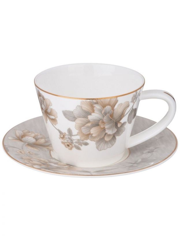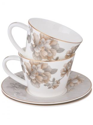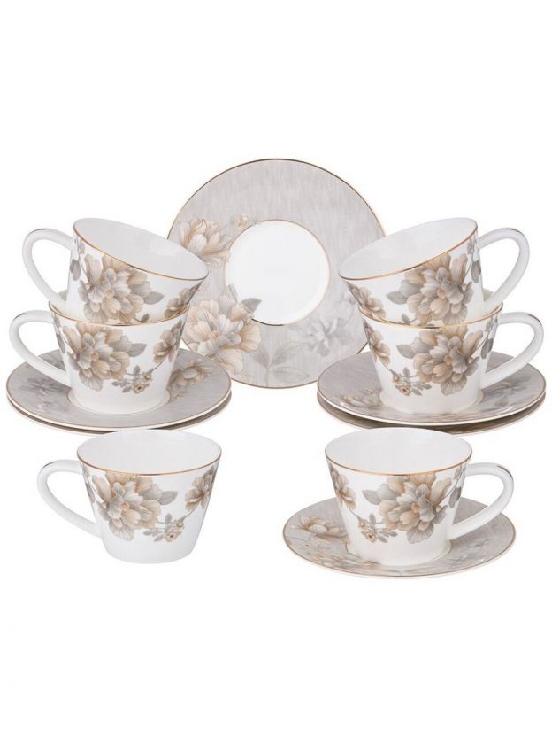 В комплекте 12 предметов: 6 чашек объёмом 220 мл и 6 блюдец. Материал — фарфор, стиль — современный, тематика — цветочно-растительная с золотой каймой.