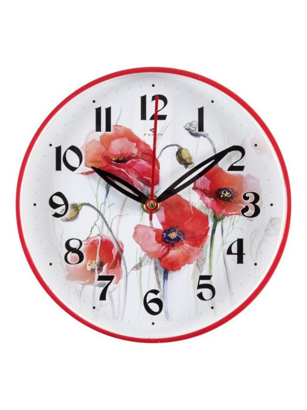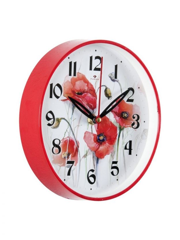 Часы настенные, кварцевые, 19.5 см, корпус красные, круглые, Рубин, Маки, 2019-101