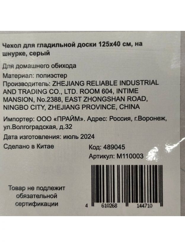 Чехол для гладильной доски 125х40 см, серый, на шнурке, тефлон