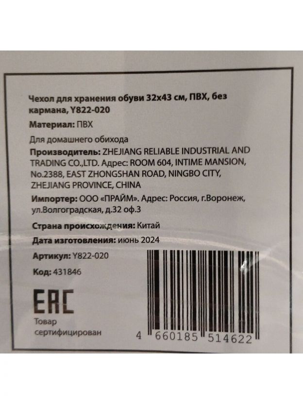 Чехол для хранения обуви 32х43 см, ПВХ, без кармана, Y822-020