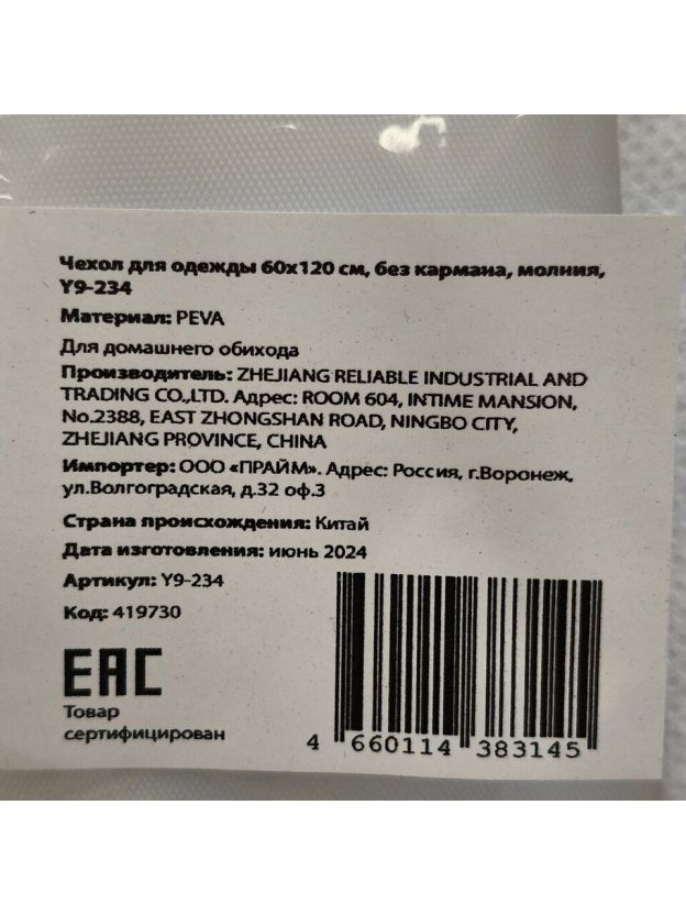Чехол для одежды 60х120 см, полиэстер, без кармана, молния, Y9-234