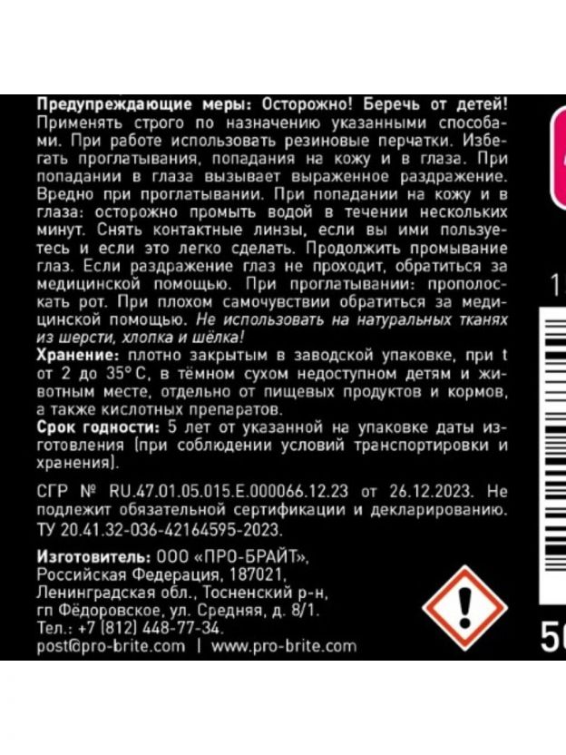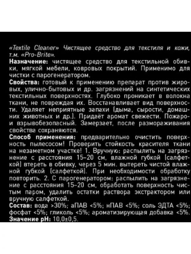 Идеальное решение для чистоты и свежести: чистящее средство Pro-Brite Textile Cleaner эффективно удаляет загрязнения с ковров и обивки мебели. Формула подходит для регулярного ухода, придавая вещам опрятный вид и свежесть. Объем 500 мл удобен для домашнего использования. Преимущества: глубокое очищение; бережное воздействие на ткани; быстрое обновление внешнего вида мебели и ковров; экономичный расход. Покупка обеспечивает легкость поддержания чистоты без лишних усилий. Дополнительная информация: Только для синтетических тканей, для натуральных не подходит.