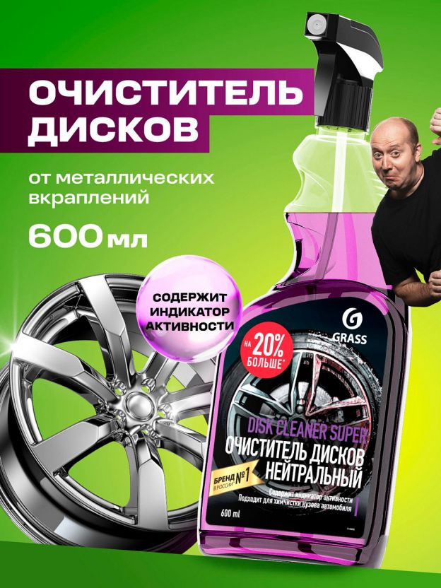 Мощное аэрозольное средство для дисков и шин от металлических вкраплений и тяжелых загрязнений Grass Disk Cleaner Super 600 мл — быстрое удаление сложных загрязнений, экономия времени и идеальная чистота! Почему выбирают: Профессиональная формула — эффективно растворяет дорожную грязь, битум и следы реагентов даже при минимальных усилиях. Увеличенный объем 600 мл — хватает на полный уход за комплектом колес легкового авто или внедорожника. Универсальность — подходит для мойки автомобилей в городе, на даче и для сезонной подготовки транспорта. Нейтральная ph-формула состава безопасна как для колесных дисков, так и для кузова автомобиля. Disk Cleaner Super незаменим для удаления въевшейся тормозной пыли на дисках, которую невозможно полностью очистить обычными средствами. Disk Cleaner Super расщепляет загрязнение за несколько минут, приобретая малиновый оттенок. Аэрозольный очиститель дисков и шин Grass Disk Cleaner Super — это выбор автолюбителей и профессионалов, которым важно быстро и безопасно вернуть колесам первозданный вид. Благодаря сильной формуле средство легко справляется с масляными пятнами, налетом от тормозных колодок и реагентами, не повреждая лакокрасочное покрытие и резину. Для голосового поиска: «как использовать очиститель дисков», «подходит ли для литых и штампованных колес» — ответ: да, средство универсально для всех типов дисков и шин. В отличие от стандартных гелей и пенных составов, аэрозольная форма обеспечивает равномерное нанесение даже в труднодоступных местах, экономит расход и ускоряет процесс мойки. Если вы ищете, чем отличается этот очиститель от аналогов — обратите внимание на увеличенный объем и удобный флакон, который удобно брать с собой в поездки или использовать на даче. Для тех, кто спрашивает «что лучше для быстрой чистки колес», — это оптимальный выбор по соотношению цена/качество и эффективности. Выбирайте Grass Disk Cleaner Super с выгодой: быстрая доставка, гарантия оригинальности и поддержка при выборе. Закажите сейчас — и ваши диски всегда будут сиять! Частые вопросы: Как использовать аэрозольный очиститель дисков Grass Disk Cleaner Super? Распылите средство на охлажденную поверхность диска и шины с расстояния 15-20 см, оставьте на 1-2 минуты, затем смойте водой или протрите губкой. Объем флакона — 600 мл, чего достаточно для нескольких применений. Подходит ли этот очиститель для всех типов дисков? Да, Grass Disk Cleaner Super подходит для литых, штампованных, хромированных и окрашенных дисков, а также для шин. Не повреждает покрытие при соблюдении инструкции. Какой объем и форма выпуска у Grass Disk Cleaner Super? Средство выпускается в аэрозольном флаконе объемом 600 мл, что удобно для хранения и использования в любых условиях. Способ применения: Охладите поверхность перед нанесением средства! Взболтайте средство перед применением! 1. Помойте автомобиль при помощи бесконтактного шампуня. 2. Нанесите состав Disk Cleaner Super на загрязненные участки. Дождитесь окраски состава в малиновый цвет. Для очистки тяжелых загрязнений на колесных дисках, рекомендуется выдержать состав на поверхности не менее 3 минут, затем удалить загрязнение при помощи мягкой щетки, кисти или губки. 3. Тщательно промойте обработанные участки мощной струей воды. Состав: _30% вода очищенная; _5, но