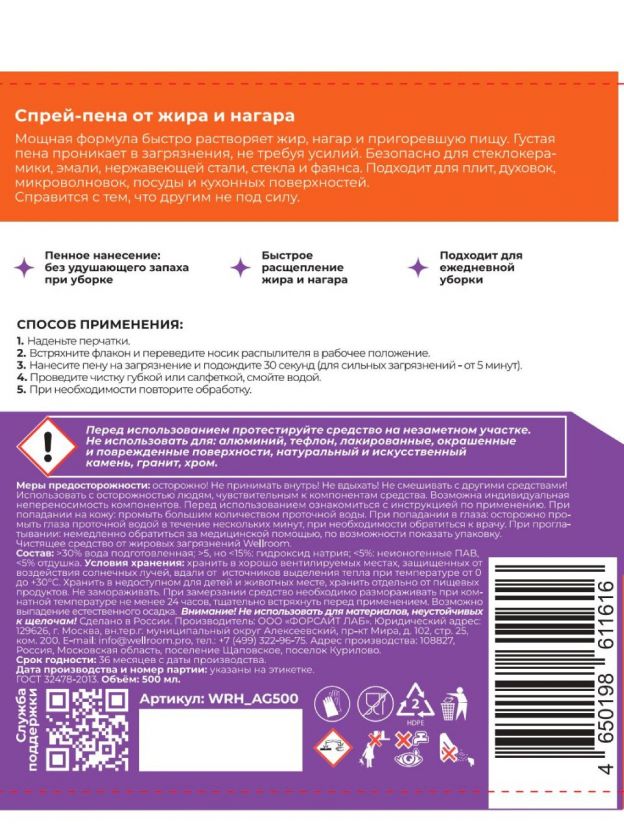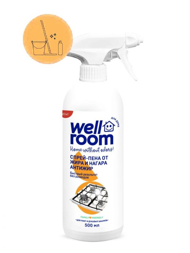 Чистящее средство для кухни, спрей-пена, Wellroom, Антижир, 500 мл