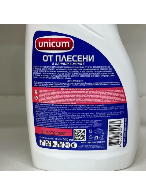 Средство для удаления плесени и грибка в ванной комнате. Высокотехнологичное средство для чистки керамической плитки, фарфорового, фаянсового и пластикового оборудования ванных, душевых и туалетных комнат. Средство уничтожает бактерии, плесень и грибок, особенно эффективно действует в труднодоступных местах — межплиточных швах, трещинах, стыках. Характеристики: Состав: деионизированная вода >30%, гипохлорит натрия 5-15%, АПАВ Объем: 500 мл; Хранить в сухом прохладном месте при температуре от +5°С до +30°С; Бренд: Unicum. Преимущества: Антибактериальный эффект; Удаляет неприятные запахи; Возвращает первозданную белизну. Применение: Нанести средство на обрабатываемую поверхность, подождать 2-3 минуты, протереть щеткой или губкой и смыть водой. В случае особо стойких загрязнений — повторить обработку.