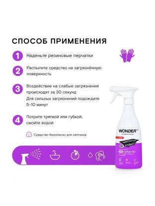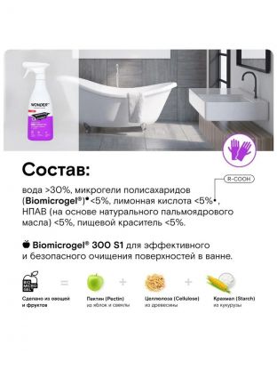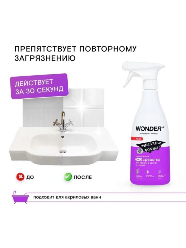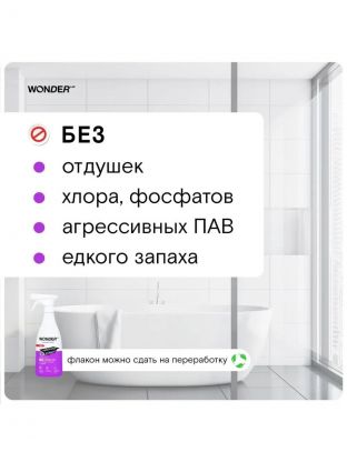Спрей для уборки в ванной комнате Wonder Lab бережно и эффективно удаляет любые типы загрязнений. Подходит для любых типов ванн, для душевых кабин и стеклянных перегородок, унитазов, смесителей, плитки. Преимущества: Не содержит хлор. Без резкого токсичного запаха. Безопасно для аллергиков. Безопасно для септика.
