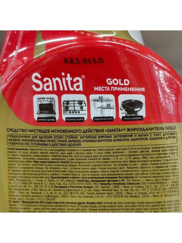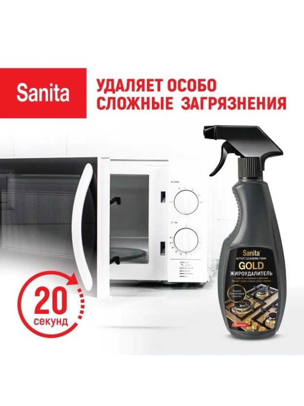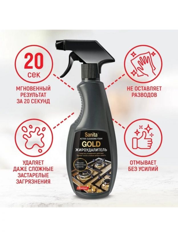 прей- Жироудалитель Sanita Gold - супермощное средство мгновенного действия для удаления особо сложных жировых загрязнений.