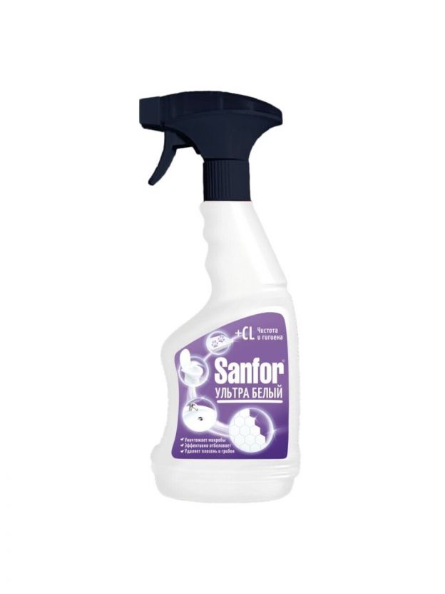 Универсальное чистящее средство для ванной комнаты и туалета. Средство предназначено для чистки и ухода за раковинами, ваннами, душевыми кабинами, унитазами, керамической плиткой, настенными панелями, моющимися обоями, бытовой техникой. Подходит для уборки туалетов для животных. Sanfor спрей "Ультра Белый" обладает антимикробным эффектом и подходит для ежедневного применения. Оставляет после уборки аромат чистоты и свежести. Эффективная формула спрея Sanfor "Ультра Белый" отлично отбеливает и чистит поверхности по всему дому, уничтожает микробы, удаляет плесень, жир, грязь, мыльные потеки, серый налет, пятна различного происхождения. Характеристики: Объем: 500 мл. Преимущества: Антискользящая поверхность. Экономичный расход. Антимикробный эффект.