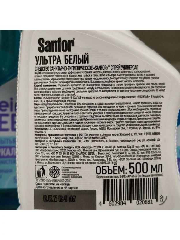 Чистящее средство санитарно-гигиеническое, Универсал, Sanfor, Ультра белый, спрей, 500 мл