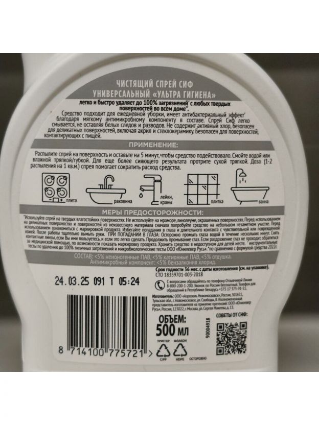 Чистящий спрей Универсальный Антибактериальный - моментальный блеск и сияющая чистота дома! Спрей обеспечивает эффективное очищение всех поверхностей в доме, а также устраняет 99,9% бактерий. Спрей не содержит хлор. Инновационная формула спрея Cif помогает легко и быстро отчистить грязь с поверхностей. Подходит для удаления кухонных загрязнений (жирные пятна, пригоревшая еда), загрязнений в ванной (мыльный и известковый налет), очищения и обработки других твердых поверхностей в доме. Обладает дезинфицирующим эффектом, убивает до 99.9% бактерий, оставляя поверхности гигиенически чистыми. Перед применением обязательно прочтите инструкцию и соблюдайте осторожность при использовании средства. Ингредиенты: 5-15%: неионогенные ПАВ,