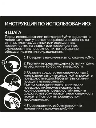 Мощное средство Cillit Bang эффективно работает на сырых поверхностях против плесени и грибка. Идеально подходит для удаления застарелых пятен, в том числе черного плесневелого налета и грибка, для различных материалов и поверхностей, таких как раковины, ванны, душевые кабины, рабочие поверхности на кухне. Легкое использование благодаря удобному распылителю. Способ применения: Наденьте защитные перчатки. Поверните носик в положение "ON". Распылите средство, держа бутылку прямо на расстоянии минимум 1-15 см от поверхности. Оставьте средство на поверхности до 15 минут. Потрите поверхность губкой или тряпкой. Тщательно смойте водой. Характеристики: Тип: чистящее средство для ванной и туалета. Назначение: против черной плесени и грибка. Объем, мл: 750. Форма выпуска средства: спрей. Особенности применения: антибактериальный эффект. Упаковка: флакон. Преимущества: Средство легко наносится на любую поверхность. Эффективно работает уже с первого раза даже с въевшимися загрязнениями. Хорошо пенится и легко смывается, не оставляя разводов на поверхности.