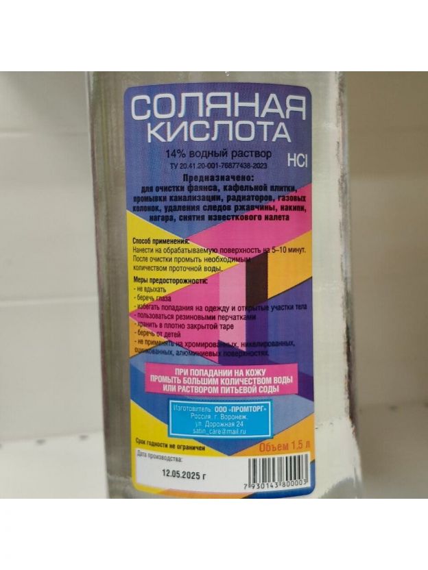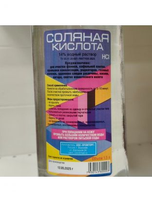 Средство Соляная кислота чистящее универсальное 1.5 кг используется для удаления известкового налета и известкового засора внутри канализационных труб, трубопроводов, на стенках бассейнов, душевых кабин, для удаления накипи в водонагревательных котлах, газовых колонках, а так же как средство для удаления ржавчины и пятен от ржавчины на санфаянсе, например, унитазе, раковине, ванной, стекле.