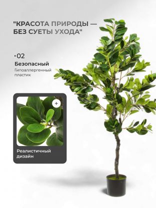 Покупка искусственного фикуса в кашпо позволяет создать уютную атмосферу без лишних хлопот и затрат времени на уход за растениями. Декоративный фикус всегда будет радовать насыщенным цветом и свежим видом, создавая гармонию и комфорт в пространстве. Такой элемент декора позволит подчеркнуть индивидуальность интерьера, добавить зелени и свежести даже в помещениях без естественного освещения. Экономия времени, долговечность и универсальность – ключевые выгоды, которые получает каждый покупатель, выбирая искусственный цветок в кашпо "Фикус" для дома или дачи.