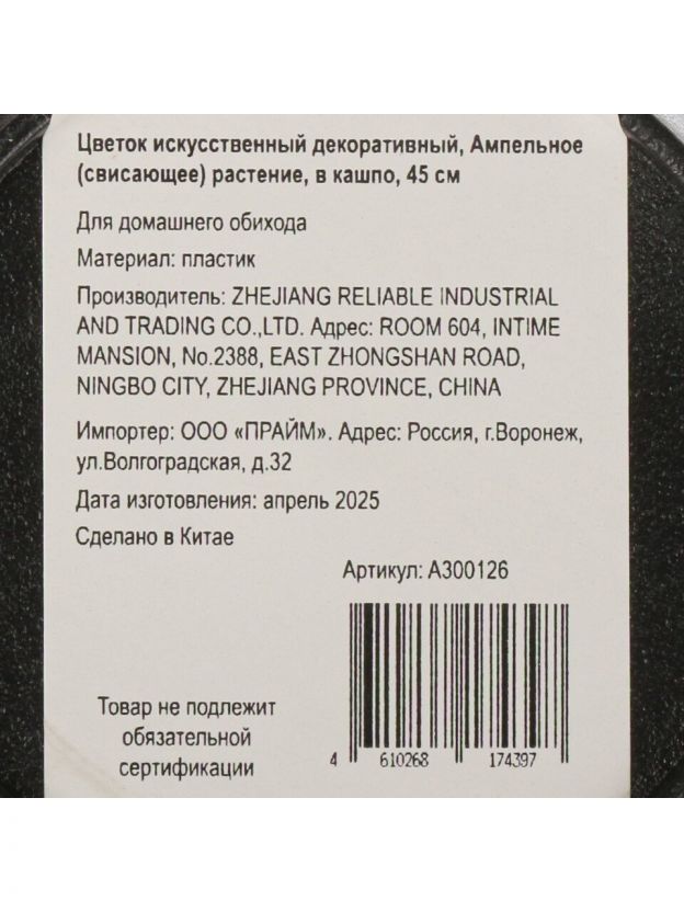 Часто спрашивают, подходит ли такое ампельное растение для подарка или украшения офиса – да, благодаря универсальному размеру 45 см и стильному виду оно станет акцентом в любой комнате. В отличие от аналогов, где часто встречается неестественный блеск или дешёвый пластик, данная модель выполнена из качественного матового материала и не выгорает на солнце. Как использовать: просто поставьте кашпо на стол, полку, кухонный гарнитур или подоконник – никакого ухода, только уют и свежесть в интерьере.