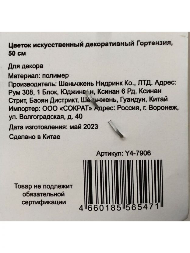 Цветок искусственный декоративный Гортензия, 50 см, белый, Y4-7906