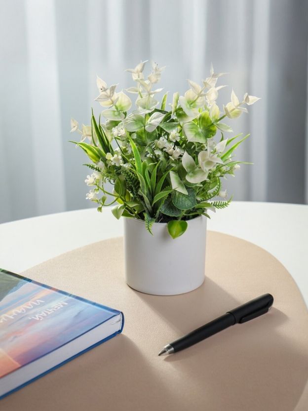 Искусственный цветок в кашпо — это современное решение для тех, кто хочет добавить уюта без хлопот по уходу. Композиция белых цветов органично впишется в любой интерьер, а благодаря натуральному зелёному оттенку и лаконичной форме станет акцентом в гостиной, спальне или рабочем пространстве. Часто спрашивают: какой искусственный цветок выбрать для декора? Этот вариант оптимален по размеру и не требует полива или пересадки.