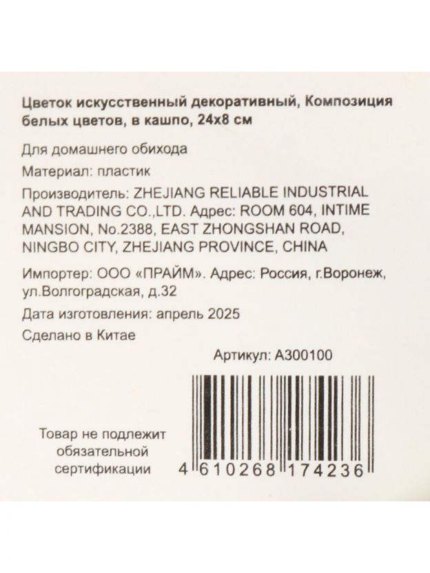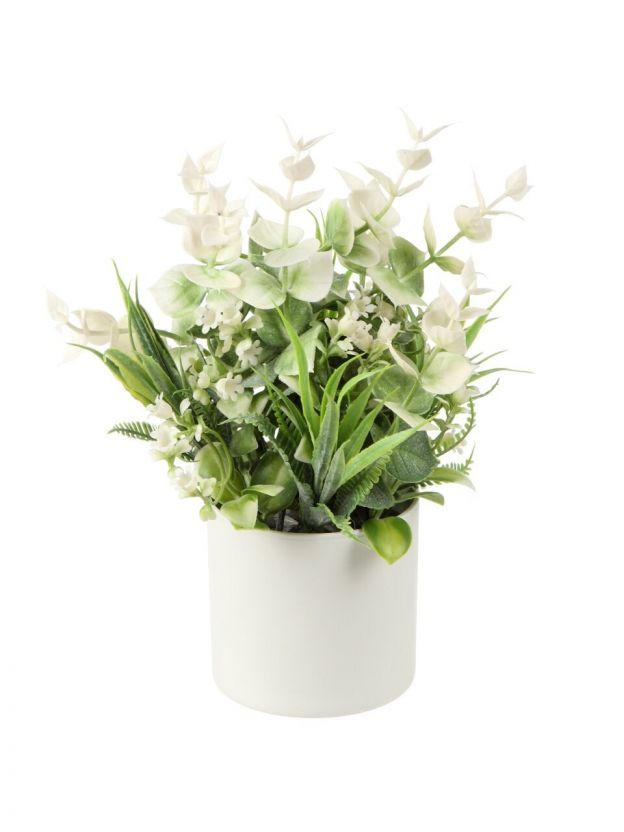 Элегантная композиция искусственных белых цветов в кашпо 24х8 см — стильное украшение для дома или офиса, не требующее ухода, по выгодной цене.