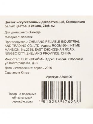 Цветок искусственный декоративный Композиция белых цветов, в кашпо, 24х8 см, A300100