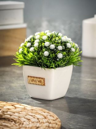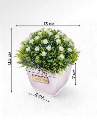- Компактный размер — всего 13 см, керамика и пластмасса: долговечные материалы, не выцветают и не требуют полива.