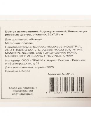 Цветок искусственный декоративный Композиция розовых цветов, в кашпо, 20х7.5 см, A300109