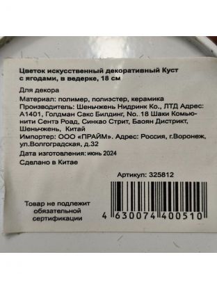 Цветок искусственный декоративный Куст с ягодами, в ведерке, 18 см, Y6-2049