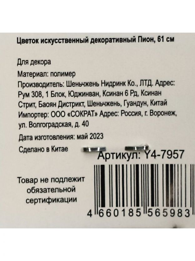 Цветок искусственный декоративный Пион, 61 см, фуксия, Y4-7957