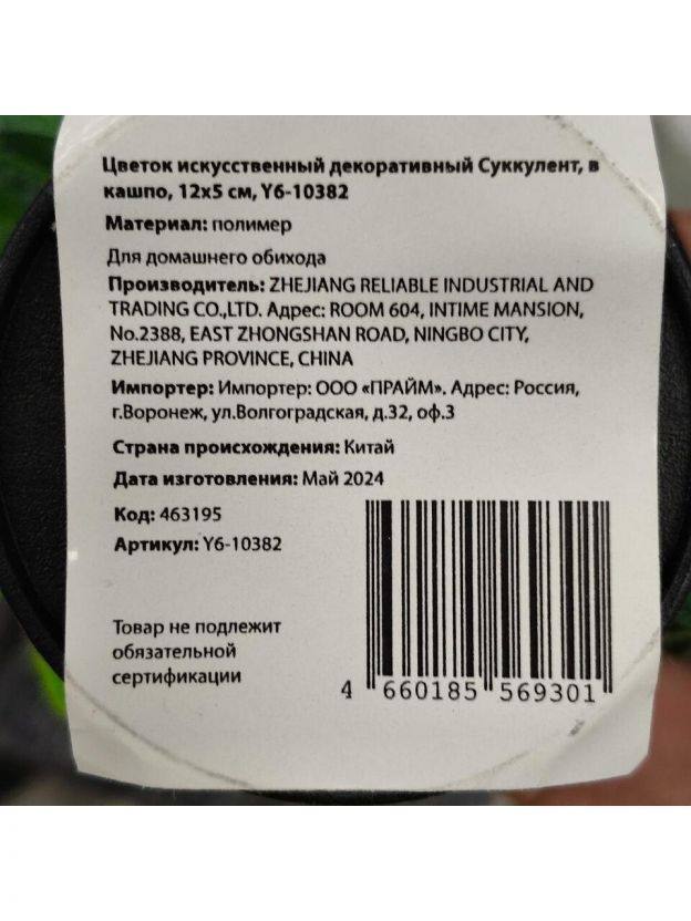 Цветок искусственный декоративный Суккулент, в кашпо, 12х5 см, Y6-10382/A300057