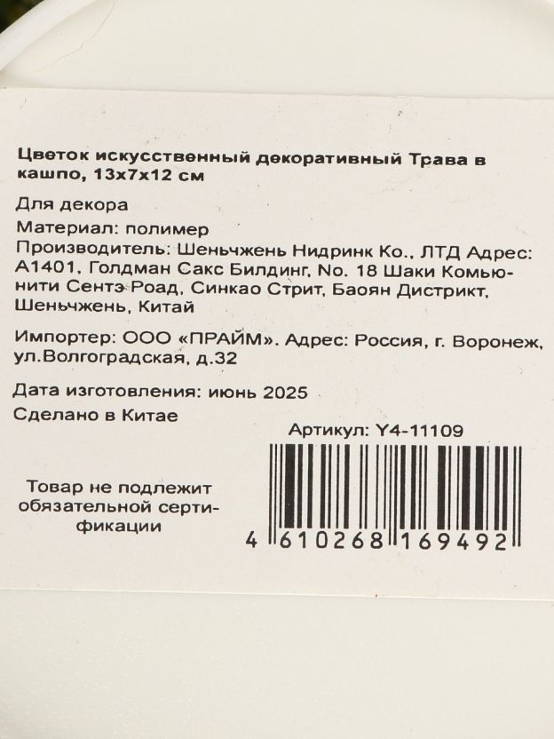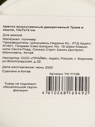 Какой размер у искусственной декоративной травы Y4-11109?