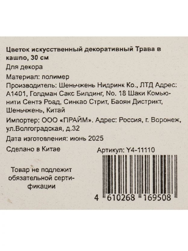 Цветок искусственный декоративный Трава в кашпо, 30 см, Y4-11110