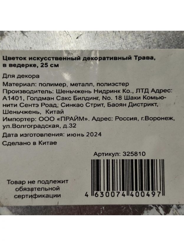 Цветок искусственный декоративный Трава, в ведерке, 25 см, Y6-2047