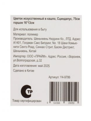 Цветок искусственный в кашпо Сциндапус, горшок 16х13 см, 75 см, Y4-9786
