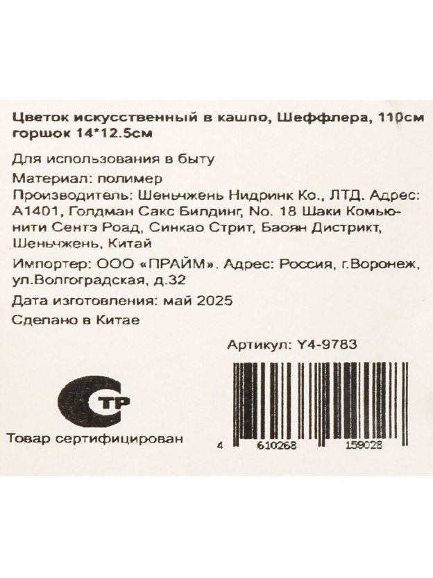 Цветок искусственный в кашпо Шеффлера, горшок 14х12.5 см, 110 см, Y4-9783