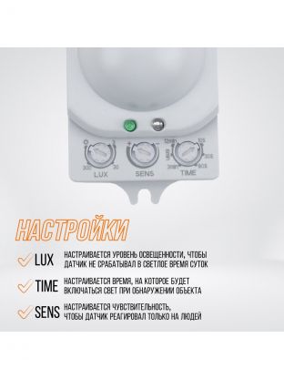 - Порог срабатывания в зависимости от уровня освещенности, от 3 лк до дневного света (регулируется).
