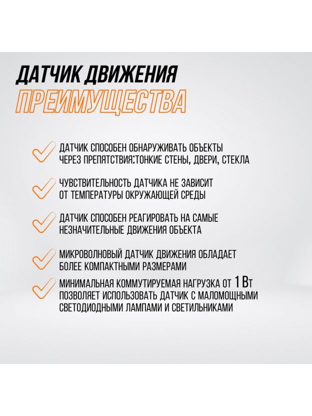 - Датчик способен обнаруживать объекты через препятствия: тонкие стены, двери, стекла и др. (в связи с этим возможно спрятать датчик под стеклом светильника, подвесным или натяжным потолком, установить внутри дома перед дверью для обнаружения объектов на улице),