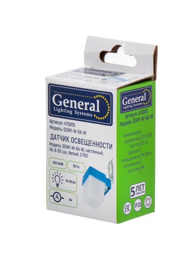 Датчик освещенности настенный, 8-30 лк, 6 А, белый, General Lighting Systems, GSW1-W-6A-W, 475 805