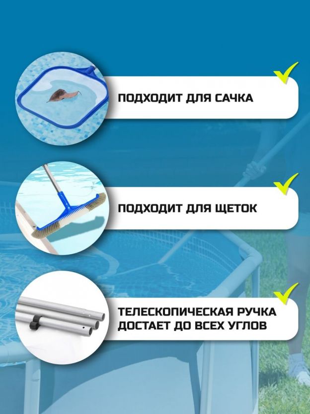 Представляем вашему вниманию телескопический держатель для сачков и щеток 360 см от Bestway, модель E-Z-Broom. Это незаменимый аксессуар для ухода за бассейном, который обеспечит легкость и удобство в использовании. Длина рукоятки регулируется от 1.42 до 3.6 метра, что позволяет адаптировать ее под любые задачи, будь то чистка дна бассейна или удаление листьев с поверхности воды. Этот держатель станет идеальным решением для поддержания чистоты и порядка в вашем бассейне.