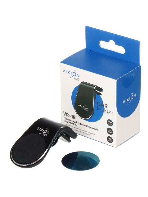 Компактный магнитный автодержатель Vixion VR-18 надёжно фиксирует девайс в машине. Выполнен в черном цвете. Подойдет к салону любого автомобиля. Аксессуар легко крепится, достаточно вставить его в воздуховод. Поддерживает горизонтальное и вертикальное положение гаджета. Комплект VIXION VR18 состоит из самого держателя и пластин для мобильного устройства на клейкой основе. Характеристики: Способ крепления: в воздуховод. Тип держателя: магнитный. Материал: полимер. Цвет: черный. Преимущества: Универсальный держатель VIXION VR-18 подходит для большинства мобильных устройств. Модель удобна и проста в установке и использовании. Комплектация: Держатель: 1шт. Пластина для мобильного устройства: 1шт.