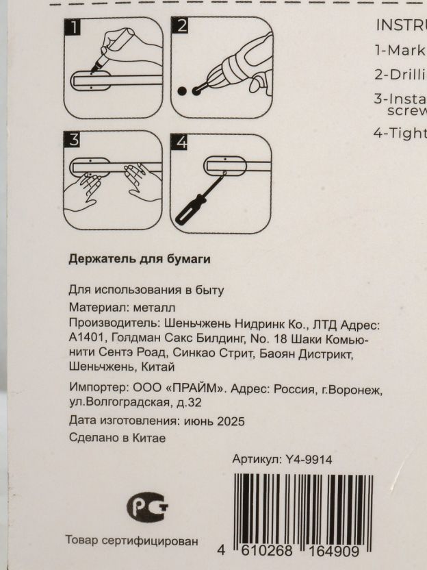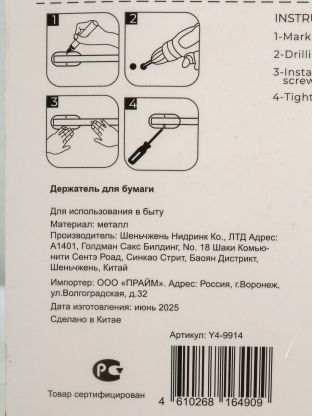 Материал — нержавеющая сталь, цвет — хром, страна продавца — Китай, универсальный размер для стандартных рулонов, артикул Y4-9914.