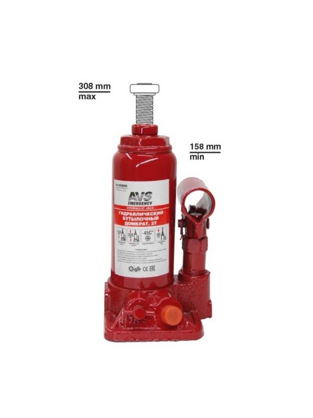 Домкрат бутылочный, гидравлический, 2 т, 158-308 мм, AVS, HJ-B2000