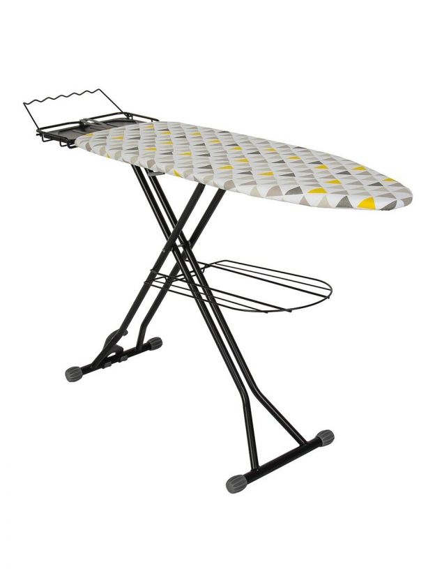 Длина рабочей поверхности — 114 см, ширина — 38 см, высота регулируется от 69 до 88 см (7 положений), длина в сложенном виде — 140 см. В комплекте: подставка для утюга, встроенная розетка, полка для белья, удлинитель 3 м, антипригарный чехол.