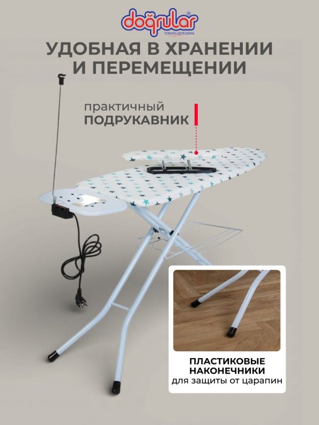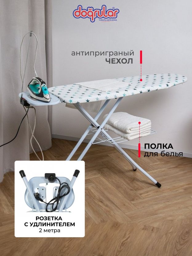 Доска гладильная 120х38 см, Капитол, подставка для утюга, встроенная розетка, полка для белья, удлинитель 2 м, Dogrular, белая