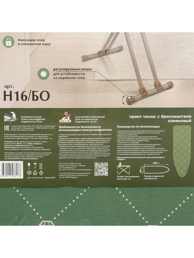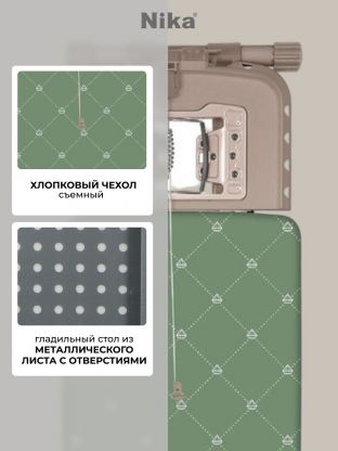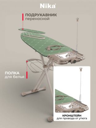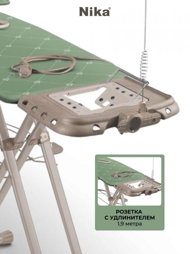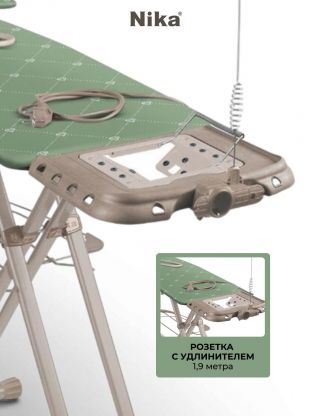 Доска гладильная 120х46 см, подставка для утюга, гладильный рукав, встроенная розетка, полка для белья, удлинитель 1.9 м, Nika, Н16, оливковая