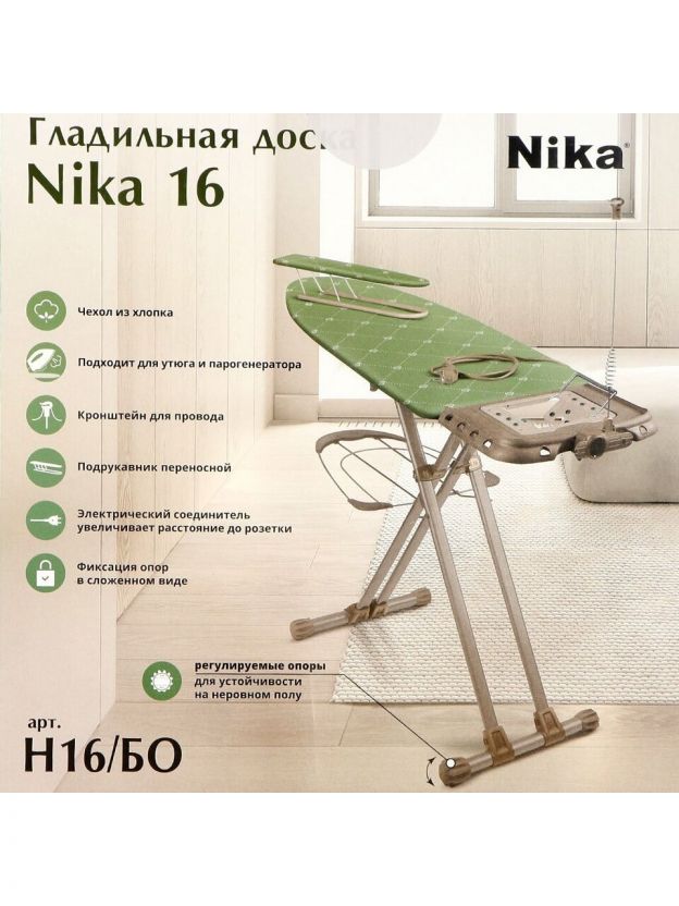 Доска гладильная Nika Н16 120х46 см с подставкой для утюга, встроенной розеткой и полкой — максимальный комфорт глажки дома и на даче. Экономьте время и силы!