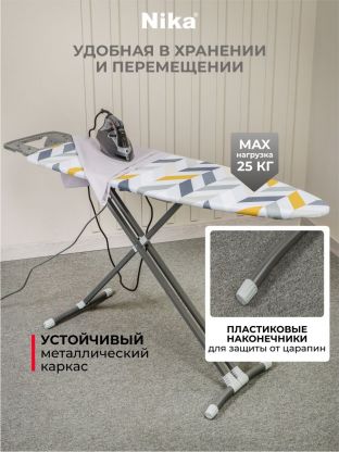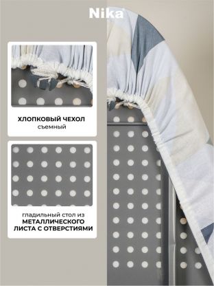 Гладильная доска Nika Н10 с рабочей металлической поверхностью и съёмным чехлом из хлопка – отличный вариант для ежедневного использования. Изделие оснащено подставкой под утюг и электросоединителем.