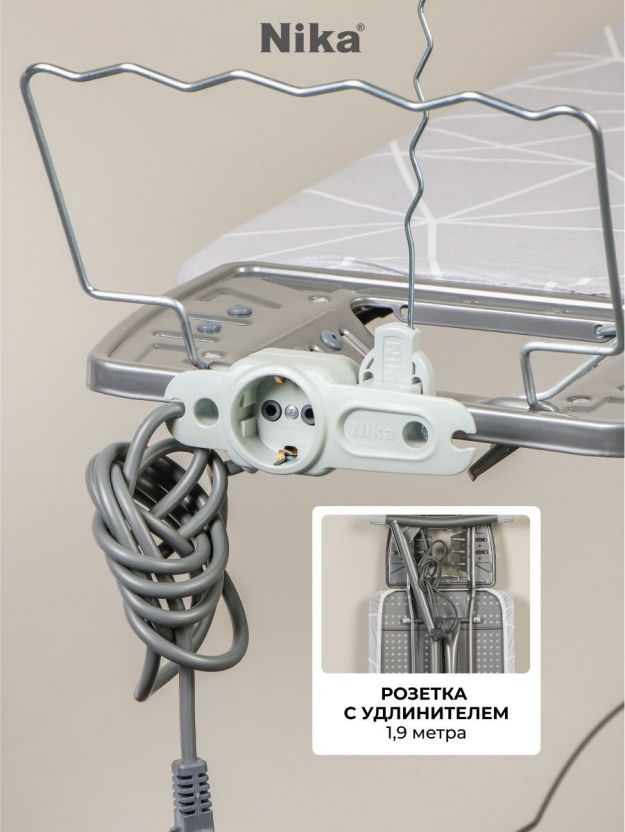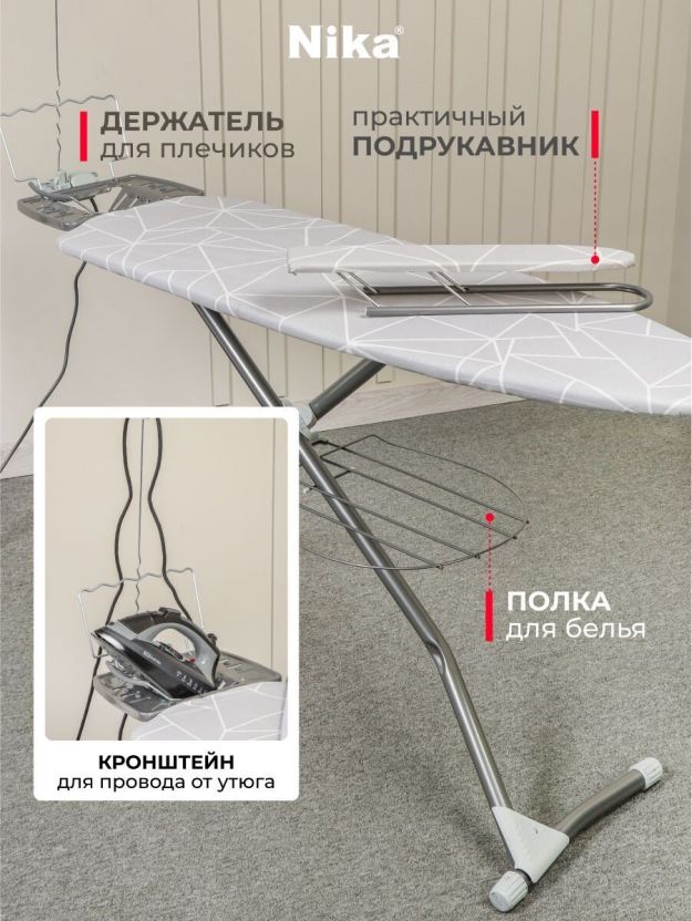Доска гладильная 122х42 см, Grant, подставка для утюга, гладильный рукав, встроенная розетка, полка для белья, удлинитель 1.9 м, Nika, НГТ/4
