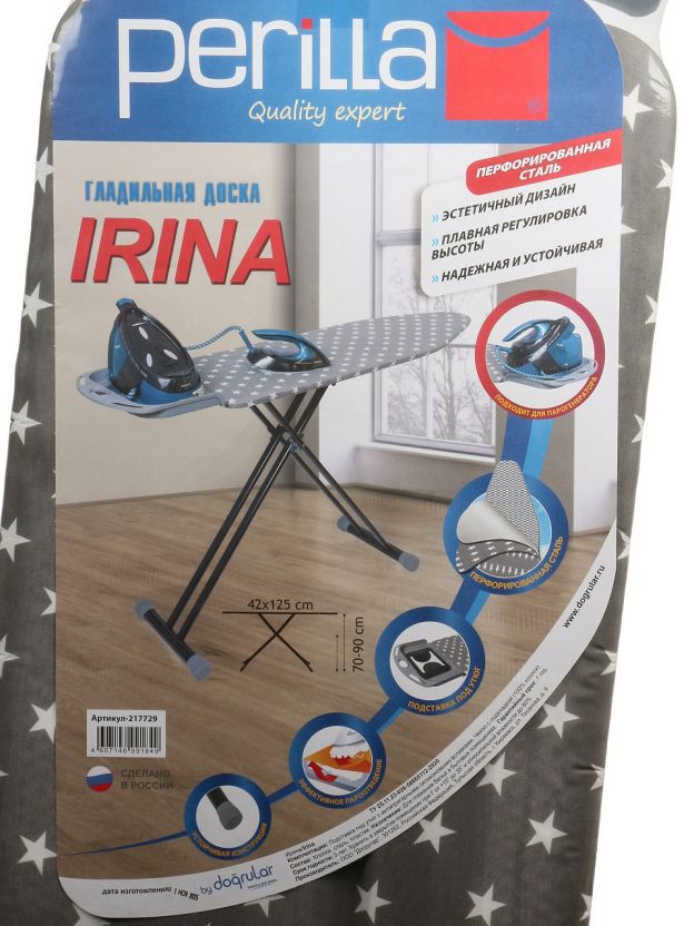 Для глажки больших вещей и постельного белья оптимальна доска длиной от 120 см. Модель Perilla «Ирина» — 125х42 см, с 8 положениями высоты (76–98 см), подходит для любых задач.