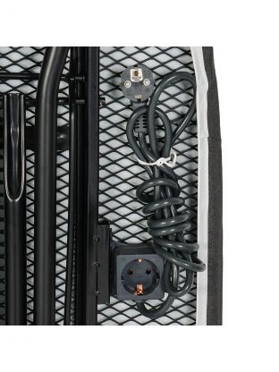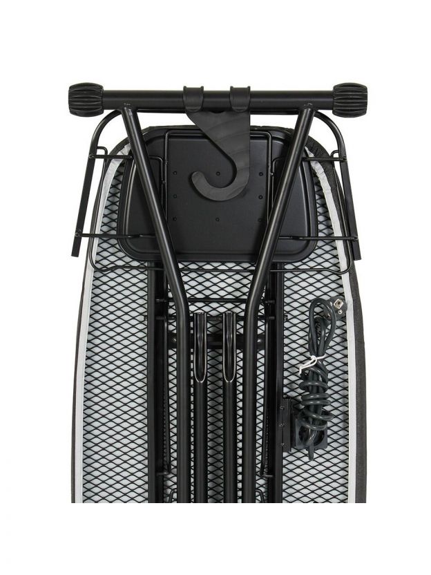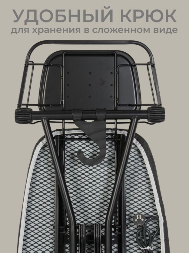 - Всё под рукой: встроенная розетка, удлинитель 1.8 м и выдвижная полка для утюга — гладьте без лишних хлопот